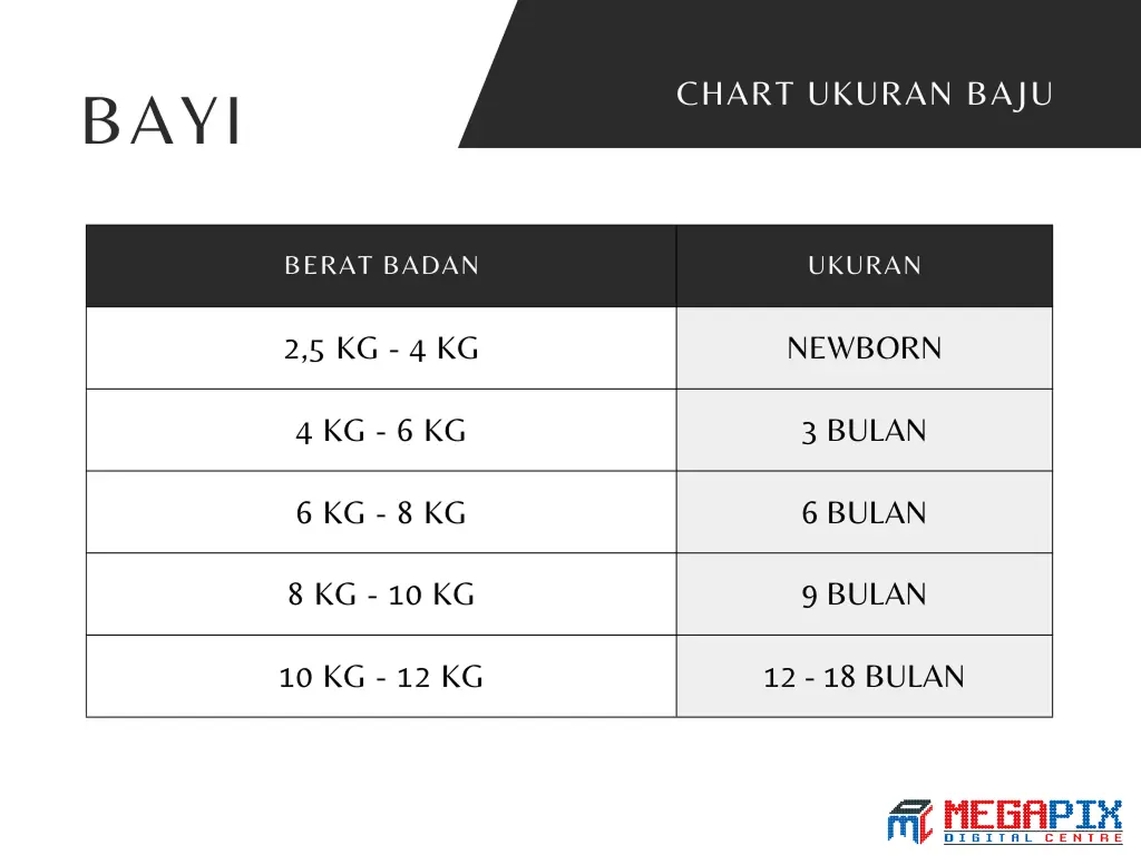 Untuk bayi, ukuran biasanya dibedakan berdasarkan usia dan berat badan: