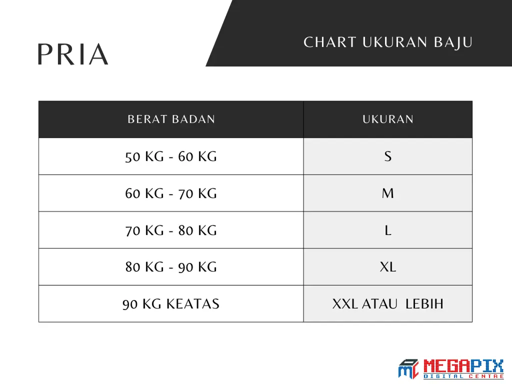 Untuk pria dewasa, ukuran baju berdasarkan berat badan yang umum digunakan adalah sebagai berikut: